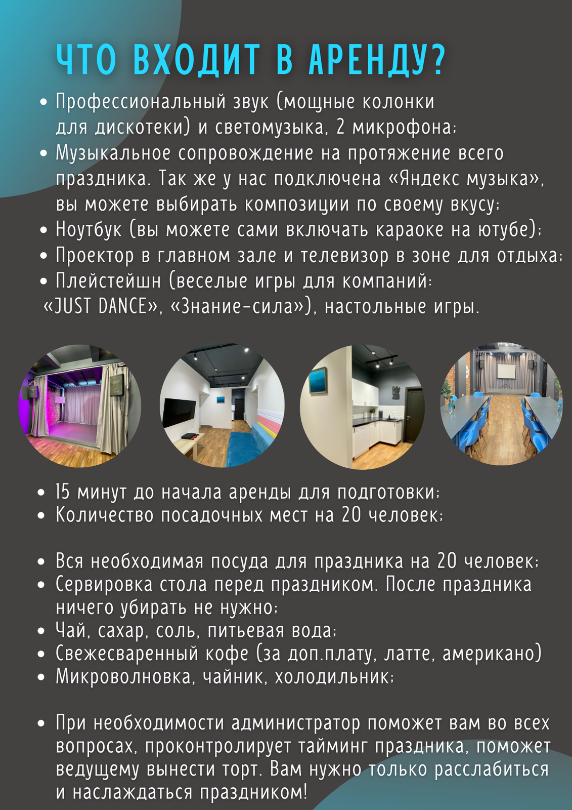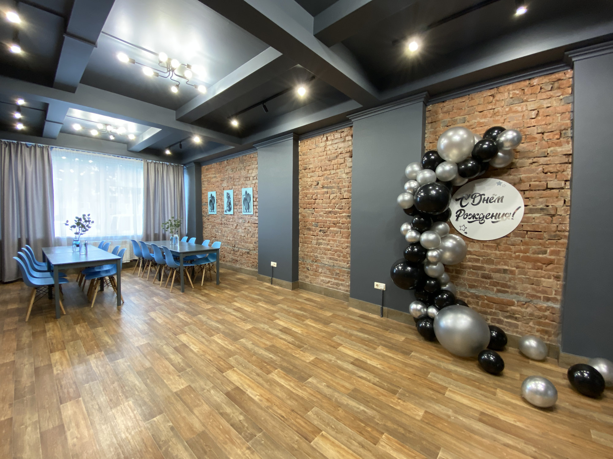 У нас вы сможете отметить, как детский, так и взрослый день рождения. А также любое другое событие в незабываемой атмосфере с уникальным дизайнерским интерьером! Вы празднуете только своей компанией, без посторонних, без выматывающей уборки и лишних хлопот! Можно приносить свою еду и напитки, либо заказать у нас фуршетное меню.
