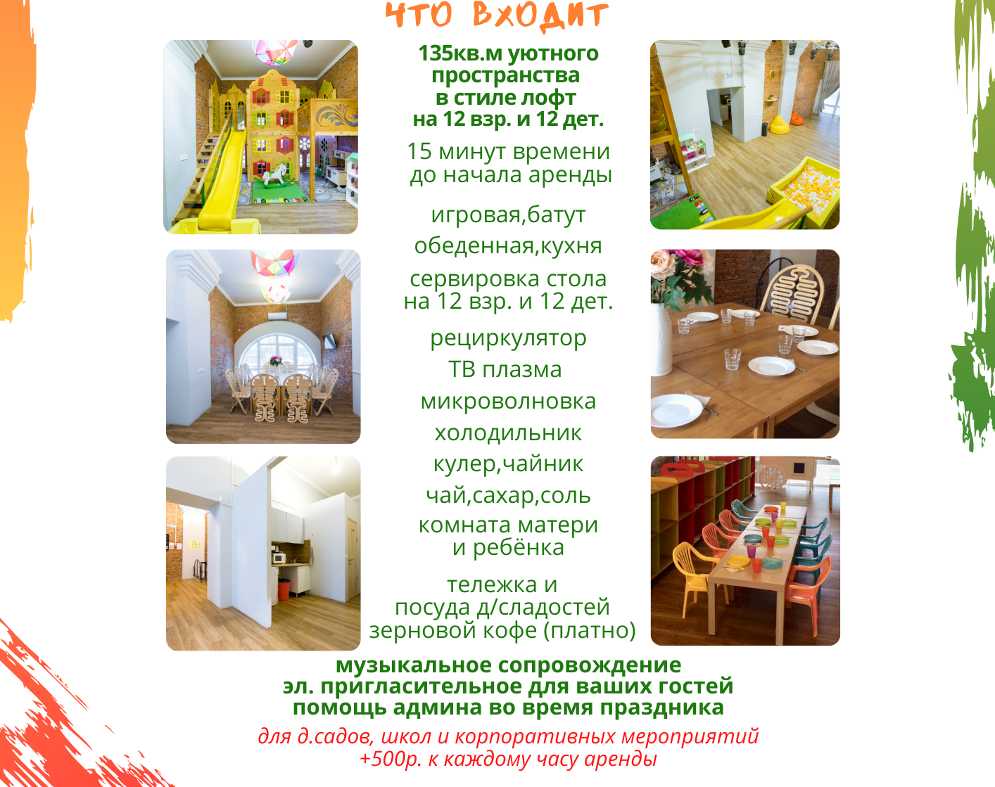 Мы организовываем праздники "под ключ": аренда зала, ведущие, крутые вечеринки, квесты, шоу-программы, оформление, фотографы и многое другое. У нас есть 2 зала: один с игрушками, домиком и горкой и другой без игрушек, со сценой и караоке.